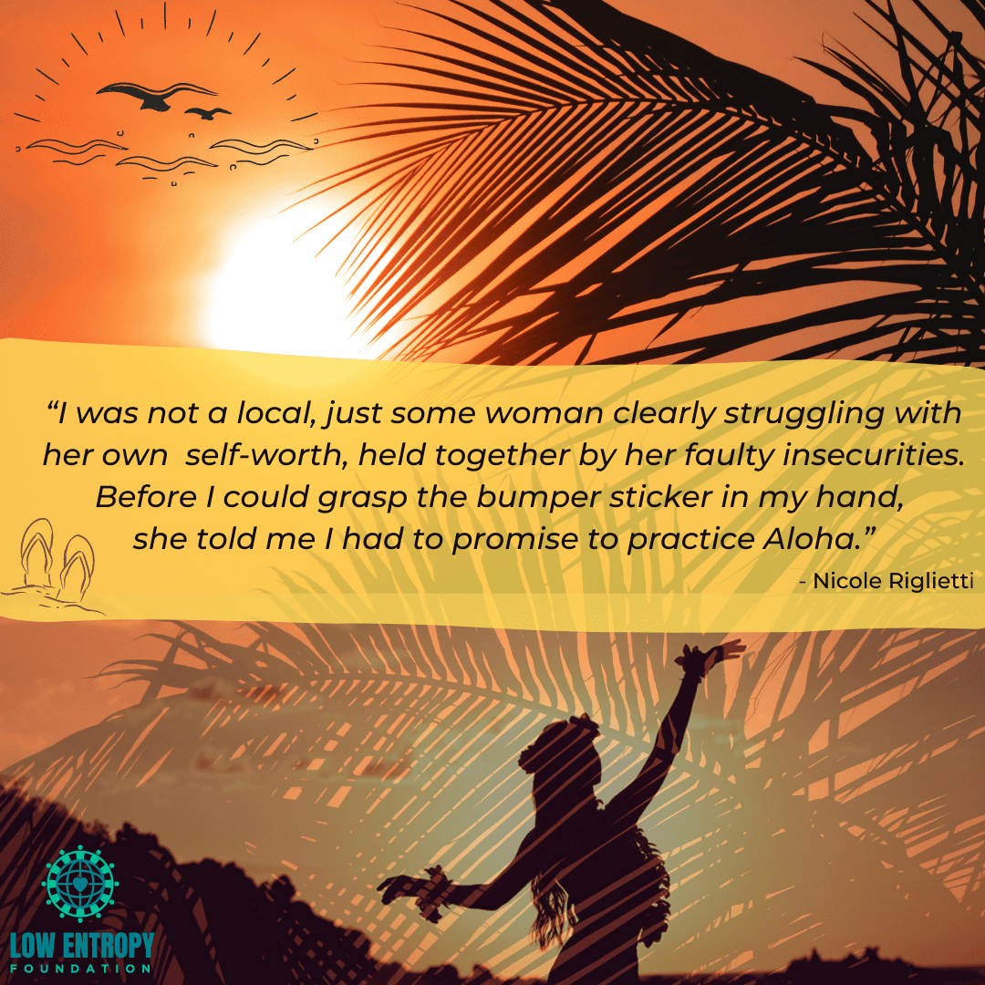 Low Entropy Volunteer Writer Nicole Riglietti takes us on a transformative voyage, escaping from despair and self-contempt to Hawaii and the curative love of the Aloha Spirit.