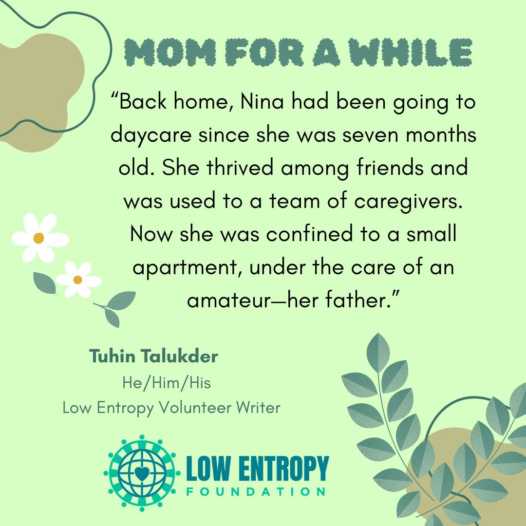 Back home, Nina had been going to daycare since she was seven months old. She thrived among friends and was used to a team of caregivers. Now she was confined to a small apartment, under the care of an amateur—her father.