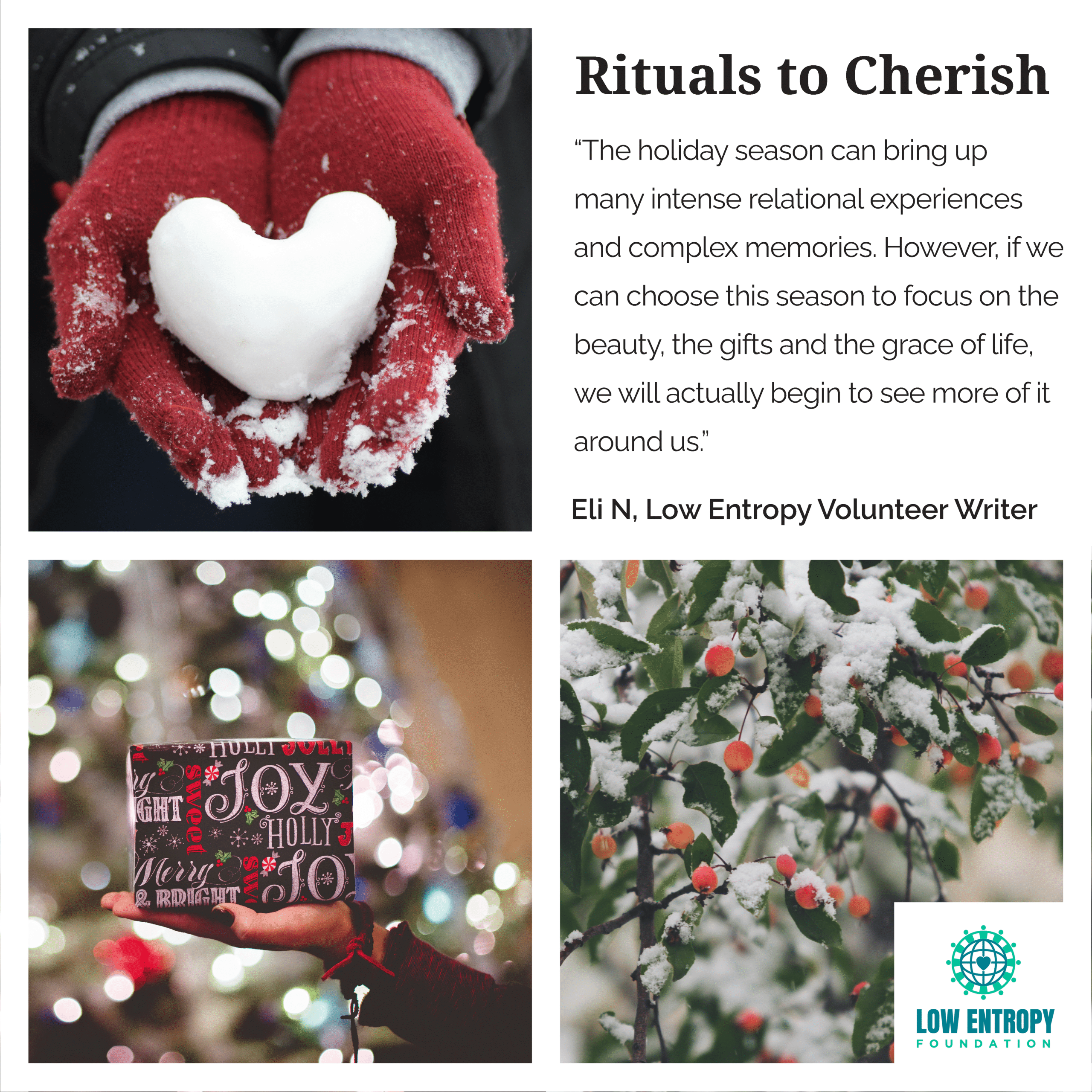 The interactions between human beings are complex and often messy. However, this is an opportunity to reflect on the gentle and special aspects of human connection. During the holiday months there are great ways in which human beings show care for one another. For example, some organize Christmas charity events for children or open soup kitchens for the homeless. Recall the last time you witnessed a beautiful human moment of strangers sharing kindness, or a moment of a community showing generosity and forgiveness. How did those moments elicit feelings of awe and wonder? The traditions of sharing gifts with one another, showing appreciation for the people in our lives and gathering for meals are great rituals to cherish.
